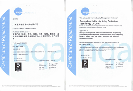 廣州市海德防雷科技有限公司已經(jīng)通過(guò)“ISO9001質(zhì)量管理體系認(rèn)證”,海德公司堅(jiān)持在該體系的嚴(yán)密監(jiān)控下嚴(yán)格挑選供應(yīng)商,嚴(yán)控生產(chǎn),確保質(zhì)量的可靠性和穩(wěn)定性。同時(shí)公司產(chǎn)品已通過(guò)“北京雷電防護(hù)裝置測(cè)試中心”、“信息產(chǎn)業(yè)部通信產(chǎn)品防護(hù)性能質(zhì)量監(jiān)督檢驗(yàn)中心”和“中國(guó)賽寶實(shí)驗(yàn)室”等國(guó)家級(jí)權(quán)威檢測(cè)機(jī)構(gòu)的嚴(yán)格檢測(cè),并經(jīng)各地防雷中心備案,為廣東省防雷中心推薦使用雷電防護(hù)產(chǎn)品。