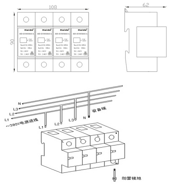 電源相線(L)、零線(N)分別接入電涌保護(hù)器相應(yīng)接線端子,保證牢固及可靠,將避雷器接地端與防雷地線(推薦接地電阻≤4Ω)作良好電氣連接。