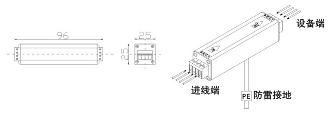 在被保護設(shè)備的線路接口前段串聯(lián)接入避雷器,“OUT”為設(shè)備端、“IN”為進線端,將避雷器接地端與防雷地線(推薦接地電阻≤4Ω)作良好的電氣連接。