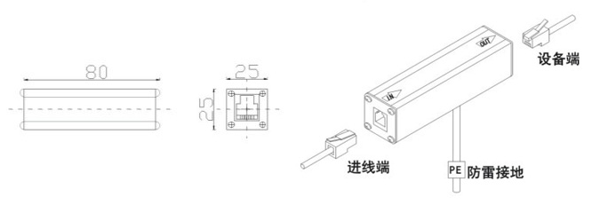 在被保護(hù)設(shè)備的線路接口前段串聯(lián)接入避雷器,“OUT”為設(shè)備端、“IN”為進(jìn)線端,將避雷器接地端與防雷地線(推薦接地電阻≤4Ω)作良好的電氣連接。